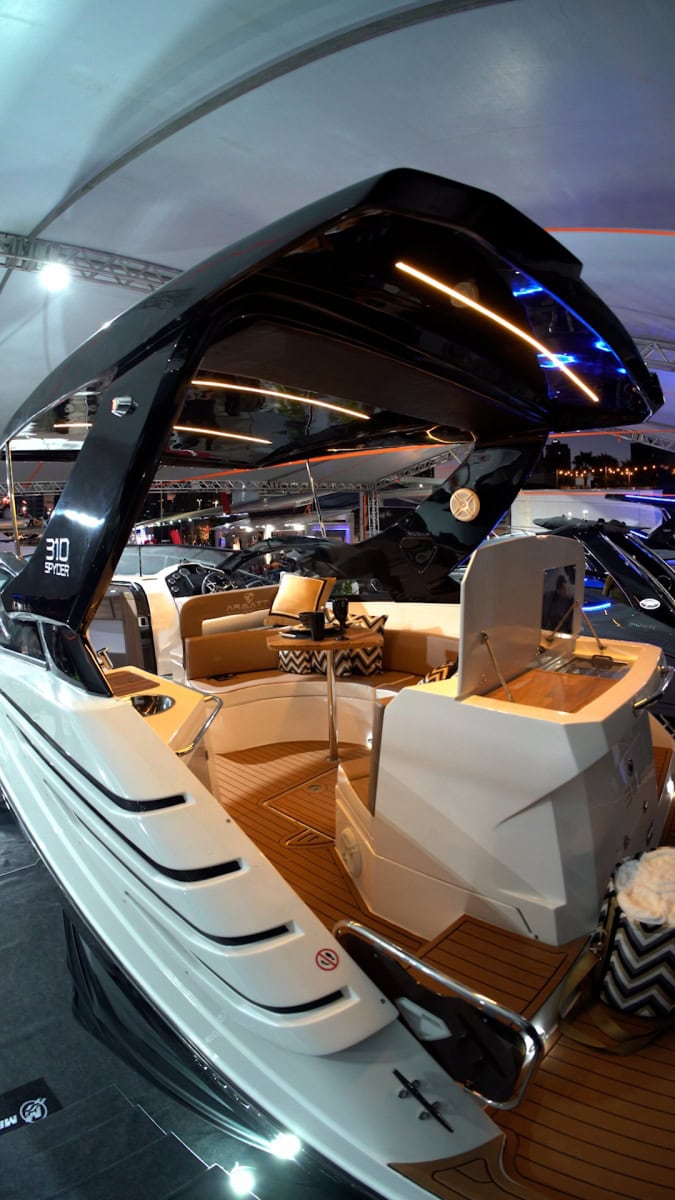 A forma curva e elegante do casco da Armatti 310 Spyder dialoga perfeitamente com os detalhes em inox, como os guarda-mancebos e as entradas de ar salientes nas laterais, que reforçam sua personalidade esportiva e sofisticada. O para-brisa envolvente completa o conjunto com um toque de fluidez e modernidade.